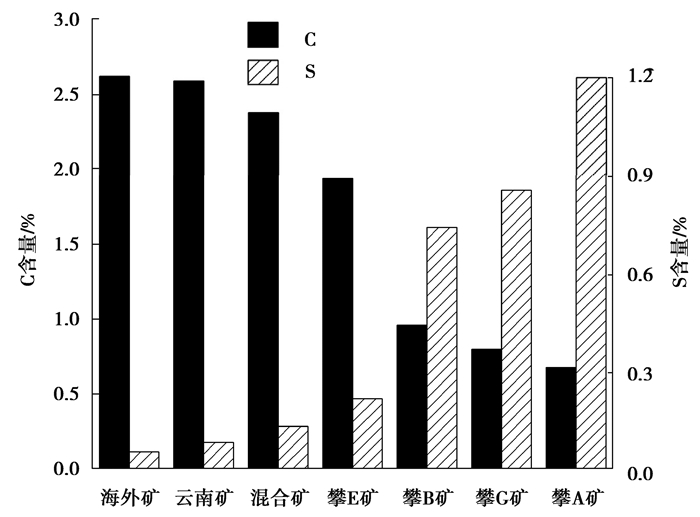 图 1 不同钛精矿生产的半钢C含量 Fig. 1 C and S contents of semi-steel produced by different titanium concentrates |