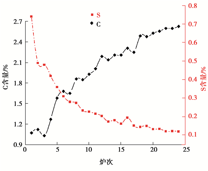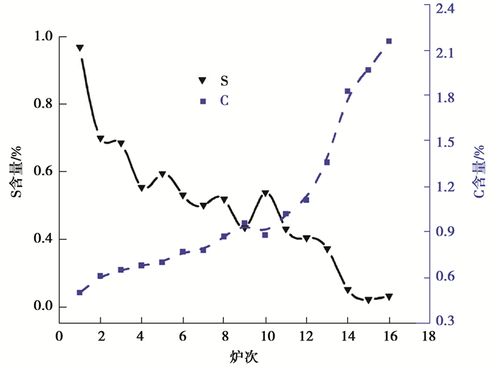 从图 1还可看出,钛渣铁水S含量越高,C含量越低。为研究钛渣铁水中S、C含量相互关系,开展了由高S钛精矿向低S钛精矿转变的冶炼试验,发现该过程中,随半钢S含量逐步降低,C含量逐渐升高,如图 2所示。