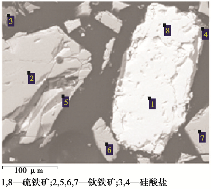 3 攀矿预氧化冶炼钛渣技术研究要确保攀矿冶炼钛渣工艺顺行,提高技术经济性,就必须降低钛精矿S含量,消除S对冶炼过程的影响。为探索合适的降硫工艺,对攀枝花高S钛精矿中硫的存在形式进行了分析,结果如图 3(SEM结果)和表 6(EDS结果)所示。