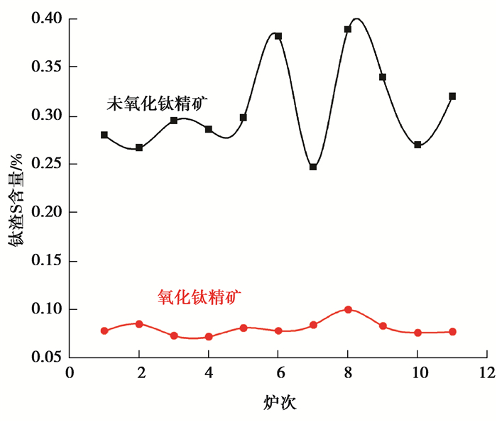 4) 钛精矿预氧化—冶炼钛渣可有效降低产品S含量,消除S对冶炼过程的影响,是高S钛精矿生产钛渣的有效途径。