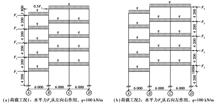 以图 1(b)所示的模型为分析对象,建立五层三跨错层框架结构模型,梁截面300 mm×600 mm,柱截面600 mm×600 mm,错层高度c=1 800 mm,材料强度等级均为C30;竖向均布荷载设计值为q=100 kN/m;水平荷载按作用方向分为2种工况,其大小为对应结构最大弹性层间位移角达到或接近1/550时相应的设计值。具体如图 2所示。
