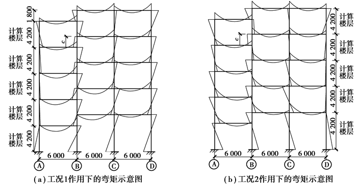 分析发现错层框架结构受力复杂,但弯矩分布也呈现一定的规律性。当水平荷载从左向右作用时,错层柱(B轴线所示)柱端弯矩出现在柱与其左侧梁相交的节点处;当水平荷载从右向左作用时,错层柱(B轴线所示)柱端弯矩如图 3所示,将会出现在柱与右侧梁相交的节点处。综上所述,对于错层框架结构的“计算楼层”可定义为与水平荷载作用一侧的楼层一致,并按此计算楼层对错层柱进行内力计算和配筋设计。