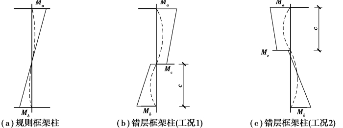 图 4(a)为普通规则框架柱所受弯矩及挠曲变形示意图,图 4(b)、图 4(c)所示2种荷载工况作用下,错层框架结构模型中某层错层柱的弯矩及柱挠曲变形示意图。由图 4可以看出,按照此方法定义错层框架中错层柱的“计算楼层”后,错层柱均发生双曲率挠曲变形,反弯点位置为中部。错层柱中部位置由于梁端集中弯矩MC的作用,进一步增大了该错层柱的挠曲变形,故而错层柱的二阶效应比规则框架柱更加显著。