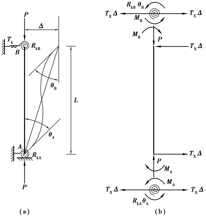 对于实际工程中的框架柱,其端部所受的约束状态和位移状态可用2个转角约束弹簧和1个侧移约束弹簧加以模拟代替,并将其独立出来,如图 5所示。若取转角刚度为RkA、RkB,侧移刚度为Tk,则对该框架柱可列出如下平衡方程[12]: