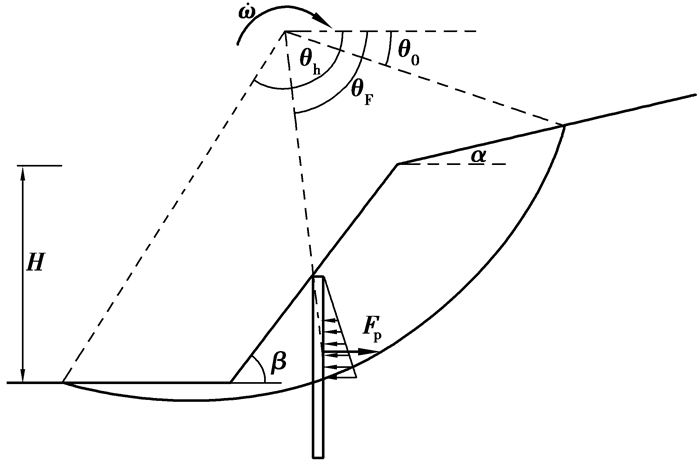 对于二维边坡的稳定问题,当土层为遵循Mohr-Coulomb准则的均质土层,或者含有埋置深度较深的软弱层、不影响边坡整体稳定时,对单排抗滑桩加固情况的研究常基于转动破坏机制,如图 1所示。此时破坏面为对数螺旋线r=r0eθ tan φ,其稳定性分析在文献[12]中有详细论述。
