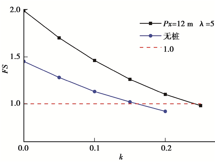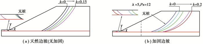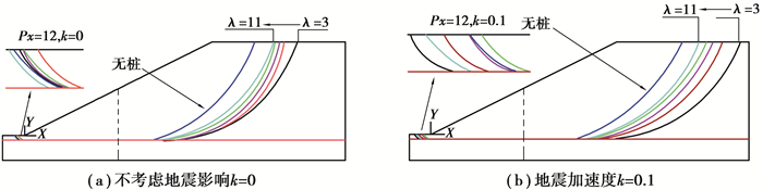 2.2 静动力加固边坡安全系数和破坏面以工况1为例,分别对无加固二维边坡和有加固二维边坡进行静、动力荷载作用时的稳定性分析。根据对边坡安全系数和破裂面的影响,主要考虑的因素包括:地震加速度k,桩体距离坡脚位置Px以及桩间距系数λ。