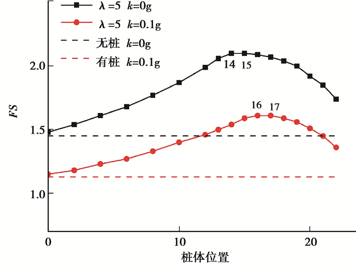 采用桩间距系数λ=5,分别对静力条件下和地震加速度k=0.1g时,不同桩体位置加强边坡的效果进行分析,研究安全系数和桩体位置的关系,如图 11所示。结果表明,边坡安全系数随着桩体位置的向右移动呈现先增大后减小的趋势。对于静力条件,安全系数在桩体位于14~15 m(坡长24 m)时达到峰值2.1;对于地震加速度k=0.1g时,安全系数在桩体位于16~17 m时达到峰值1.61。定义桩体加固最有效位置为安全系数达到峰值时所对应的桩体位置。根据Ausilio[11]基于转动破坏机构对二维抗滑桩加固边坡的稳定性分析结果,对于均质边坡,抗滑桩体的最有效位置应在靠近坡体中部。而对于含有软弱层的边坡,抗滑桩体的最有效位置则变得更为复杂,与软弱层的强度指标、埋深和倾角等因素均有关。图 11表明,对于含有软弱层的边坡桩体最有效位置位于坡体中间靠上。对于动力情况,桩体最有效位置随着地震加速度的增大而逐渐向坡顶方向移动。图 12表明,当桩体从坡脚向坡体中间移动时,边坡破裂面不断扩大;当桩体位置超过坡体中间向上时,边坡破裂面急剧缩小。桩体有效长度Hp与桩体位置明显相关,当边坡含有软弱层,可以得出,桩体有效长度最大值并不在坡体中部位置时取得,而在坡体中部偏上的位置取得。由于桩体对坡体加固的抗力与其有效长度Hp直接相关,因此,在坡体中间偏上的位置时含软弱层边坡加固桩体的最有效位置。