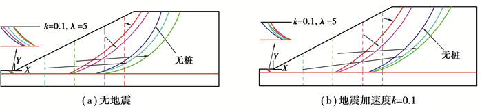 类似的,采用桩体位置Px=12 m、地震加速度k=0.1g,分别对有地震和无地震条件下的边坡进行稳定性分析,进而研究安全系数与桩间距系数关系,如图 9所示。结果表明,边坡安全系数随着桩间距系数的增大而持续减小,但这个减小的趋势在桩间距系数达到7时逐渐变得平缓。这意味着对于一定的工况,改变桩间距系数的做法对安全系数的影响不大。图 10描绘出桩间距系数与破裂面的关系,结果表明,桩体上方的破裂面会随着桩间距系数的增大而减小;坡脚位置处的破裂面对桩间距系数不敏感。