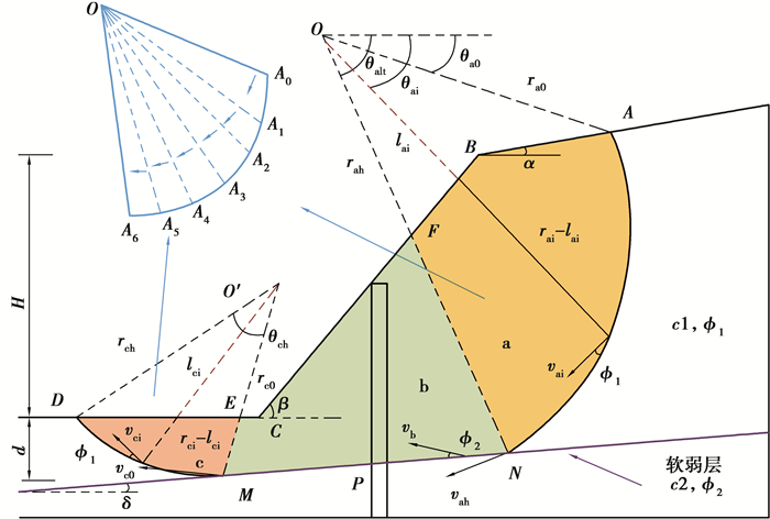 剪切区a、c的能量耗散为不连续面之间的能量耗散以及对数螺旋线破坏面上的能量耗散的总和。如图 2所示,剪切区a、c包含n个刚性块体,由于所有刚性三角形沿着与不连续面呈φ1角度的方向运动,沿着射线OA0, OA1, OA2等发生能量耗散;同时,沿着滑动面A0 A1 A2 A3 A4 A5 A6也存在能量耗散。不连续面间的能量耗散为粘聚力乘以相对速度以及土体中不连续面的长度: