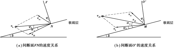 根据相关联流动法则,假定刚性体和外界土体之间的3个间断面分别为AN、NM、MD,刚性体之间的速度间断面分别为FN和O’M。其速度关系如图 3所示。