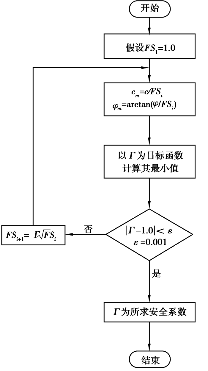 边坡的安全系数通常采用折减土的强度参数的方式[18],定义为FS=c/cm=tan φ/tan φm。对式(20)中的土体参数由安全系数进行强度折减,以Γ为目标函数,通过FSi+1=