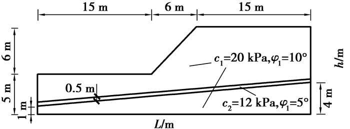 为了对文中破坏模式的正确性进行验证,首先选取已有文献中的含软弱层无加固边坡的经典算例对安全系数进行比较分析,然后求解地震荷载作用下抗滑桩加固边坡的安全系数和破坏面。