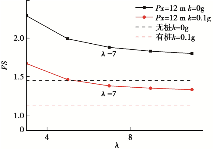 图 9 桩间距系数与安全系数的关系(FS为安全系数;λ为桩间距与桩径之比) Fig. 9 Relationship between pile spacing and safe coefficient |