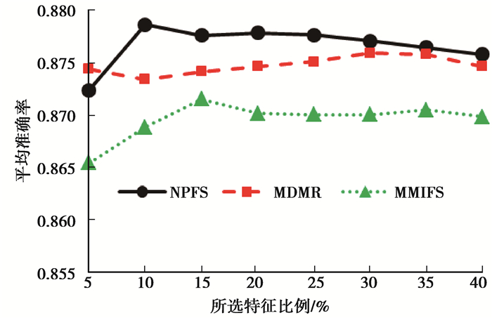 如图 1所示,随着所选特征数目增加,NPFS算法的平均准确率最高,MDMR算法平均准确率次之,MMIFS算法平均准确率最低。