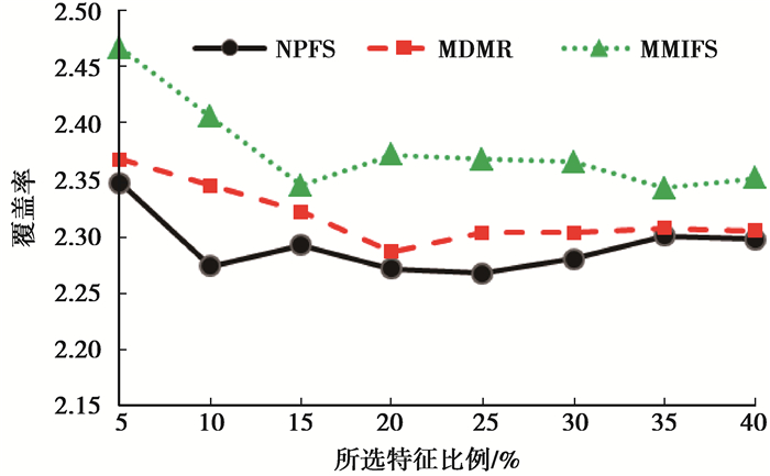 如图 2所示,随着所选特征数目增加,NPFS算法覆盖率最小,MDMR算法覆盖率次之,MMIFS算法覆盖率最高。