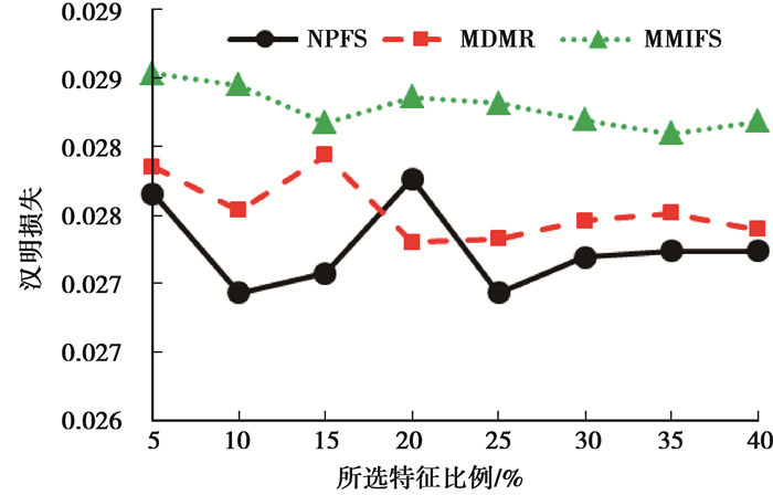 如图 3所示,随着所选特征数目增加,NPFS算法的汉明损失最小,MDMR算法平均准确率次之,MMIFS算法汉明损失最大。