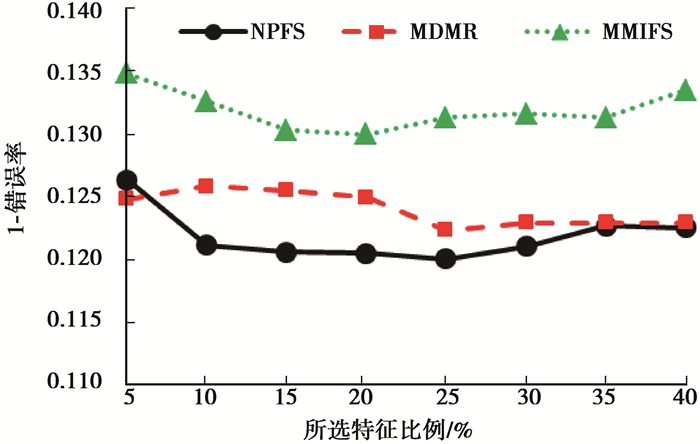 如图 4所示,随着所选特征数目增加,NPFS算法的1-错误率最小,MDMR算法1-错误率次之,MMIFS算法1-错误率最大,特征比例增加到30%后,虽然错误率有所增加,但相比于另外2种算法性能也是最好的。