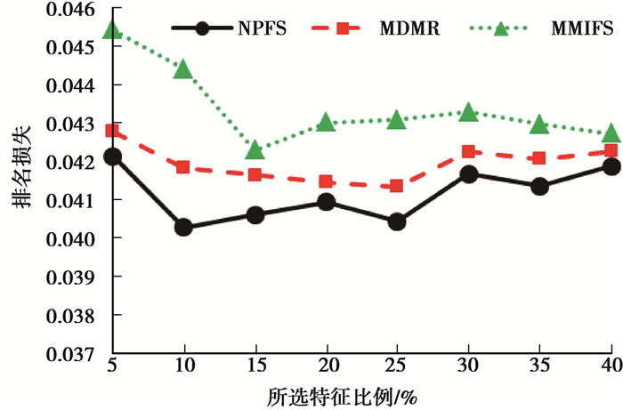 如图 5所示,随着所选特征数目增加,NPFS算法的排名损失最小,MDMR算法排名损失次之,MMIFS算法排名损失最大。