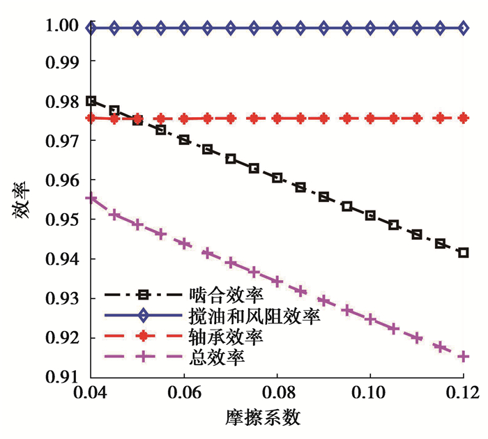 2) 随着工况参数转速、转矩、摩擦系数、齿高倍数和运动黏度的增大,系统效率均减小,其中转速、转矩和摩擦系数对总效率影响较大,齿高倍数和运动黏度对总效率的影响较小。研究结果为后续基于加载啮合特性分析,研究完整啮合周期内摩擦系数变化对系统效率的影响奠定基础。