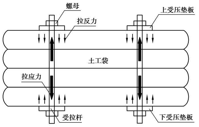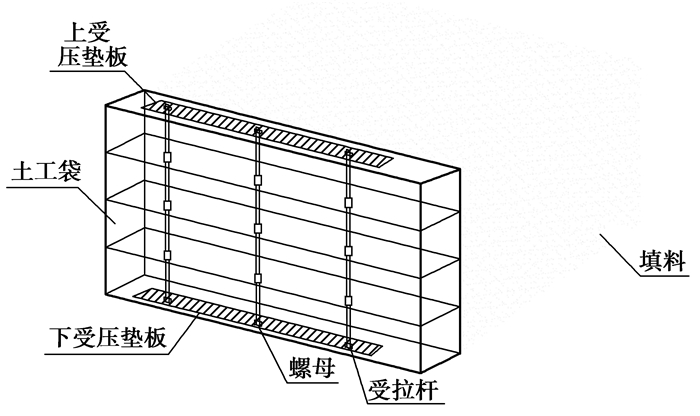 1 挡墙结构形式土工袋一体化柔性挡墙结构是在传统土工袋柔性挡墙结构的基础上加以改进,通过调整挡墙自身的结构,利用墙后土压力提高挡墙的局部或整体稳定性的一种新型挡墙。如图 1和图 2所示,挡墙结构由多个土工袋组成的墙体和受拉装置构成,其中受拉装置包括受拉杆和上下受压垫板,受拉杆件之间采用焊接或套筒连接,而与受压垫板之间采用螺母连接,可根据实际情况沿柔性分割体长边方向按照一定距离设置多排受拉装置。
