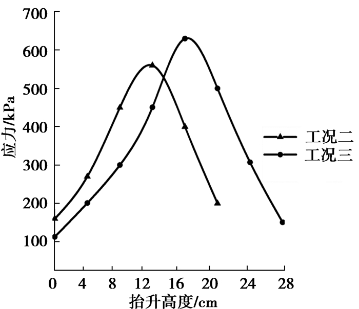 3.2 受拉装置的应力分析如图 11所示,随着模型箱抬升高度的增加,受拉装置应力均出现先增大后减小的现象,其中,工况二、工况三所产生的最大应力分别为560 kPa和630 kPa。这是由于随着模型箱的抬升,作用于墙背侧向土压力不断增加,墙体发生变形,使受拉装置应力增大。当模型箱倾斜到一定角度后,挡墙位移增大,侧向土压力减小,则受拉装置应力相应减小。