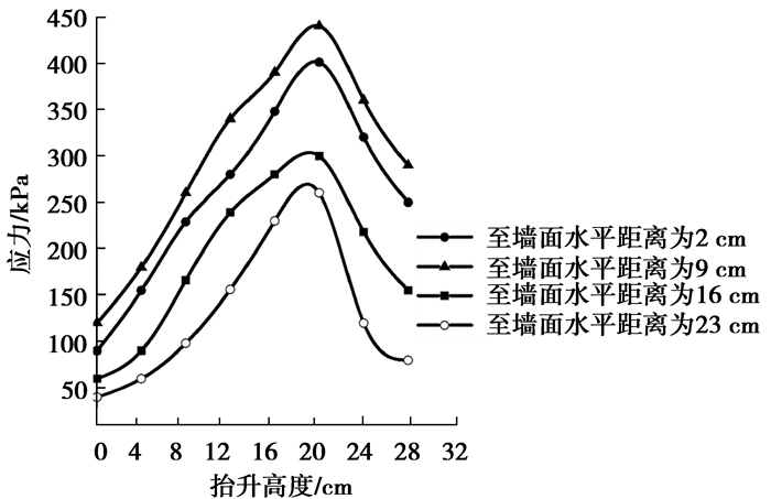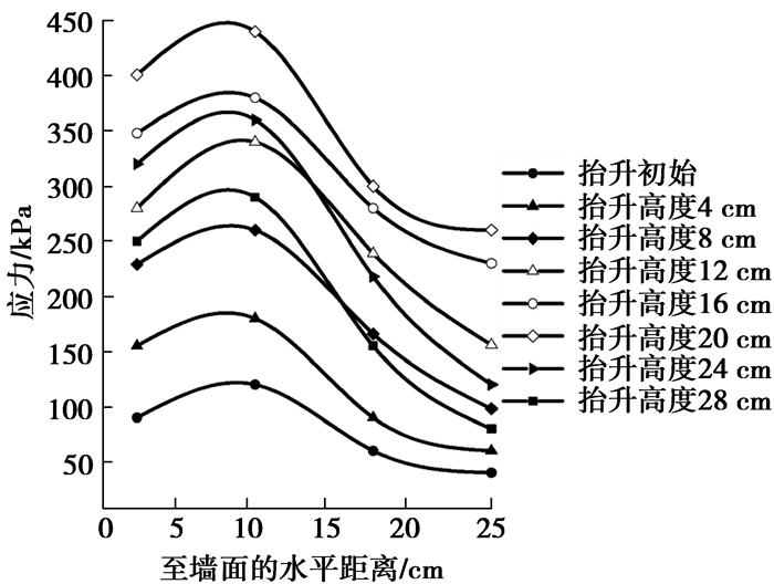 如图 12所示,随着模型箱抬升高度的增加,筋材应力先增大后减小。这是因为随着模型箱的抬升,墙体变形增加,筋材应力增大。但当模型箱抬升到一定高度,填土沿滑移面产生破坏,筋材发生向墙体方向移动,故应力减小。
