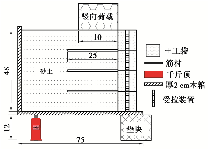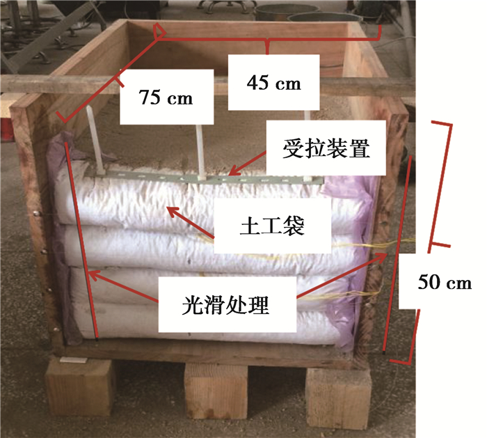 为了使模型结构尺寸的相似比与筋材强度的相似比保持相同,试验所用模型箱是四面封闭式的长方体装置,如图 3所示。该装置的尺寸为75 cm(长)×45 cm(宽)×50 cm(高)。模型箱侧壁采用凡士林和保鲜膜进行光滑处理,减少侧壁对墙体的影响。其中,实际采用尺寸为42 cm(长)×15 cm(宽)×10 cm(高)的尼龙袋子模拟土袋,工程常用土工袋大小为100 cm(长)×100 cm(宽)×100 cm(高),取相似比为1:10;土工袋的填料和墙背回填土采用砂土,取相似比为1:1。