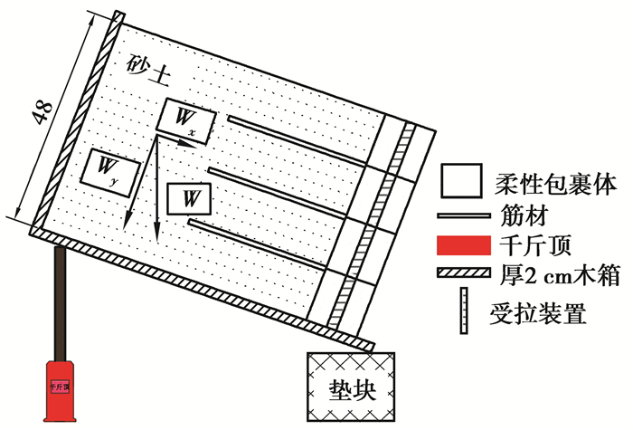 由于墙背施加水平荷载难度较大,试验通过千斤顶抬升模型箱后缘,运用砂土在垂直面板方向的重力分力Wx,模拟墙后填料的水平荷载,如图 5所示。