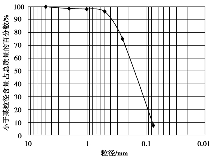 砂土的颗粒级配试验采用筛分法,颗粒级配曲线如图 6所示。砂土的击实试验采用轻型标准击实仪进行试验,密度试验采用环刀法测量,比重试验采用比重瓶法测定,直剪试验采用应变控制式直接剪切仪测定,抗剪强度曲线如图 7所示。