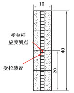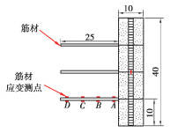 考虑不同荷载作用下,墙体发生变形,使受拉装置产生应力,其应力可通过应变片测得。为消除弯矩对应变测量的影响,试验应变片采用对称贴片方式,其位置如表 2中工况二所示。根据《公路加筋土工程设计规范》[22],筋材长度取为25 cm。结合重力式挡墙最大变形在挡墙高度H/3处,在相应位置筋材的中轴线上贴应变片,且4个测点A、B、C、D距墙面的水平距离分别为2、9、16、23 cm,如表 2中工况三所示。