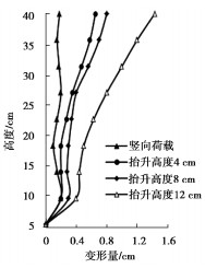 3 试验结果及分析 3.1 墙面变形的分析表 3对比了不同工况下墙面变形和墙体破坏,工况一(土工袋挡墙)墙体控制变形的能力比较低,墙面的变形量随着千斤顶抬升高度增加而增加。当抬升高度达到12 cm时,挡墙发生局部破坏,墙面顶端水平变形量达到1.6 cm;工况二(一体化柔性挡墙)挡土墙控制变形的能力显著提升,当抬升高度达到12 cm时,墙面顶端的水平变形量为0.34 cm,相比工况一减少78.7%,这是由于土工袋体之间产生了一体化的效果。当抬升高度达到16 cm,挡墙才发生破坏,其破坏类型为整体破坏;工况三(加筋一体化挡墙)在工况二基础上进行了加筋强化,其控制墙面变形能力更强。当抬升高度达到12 cm时,墙面顶端的水平变形量仅为0.23 cm,相比工况一减少85.6%,这是由于筋材和墙体产生了一体化的效果,可显著提高墙体抵抗变形的能力。当抬升高度达到28 cm时,挡墙才发生破坏,其破坏类型为整体破坏。