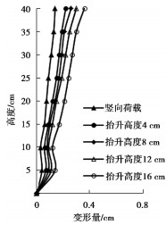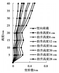 3) 撤去竖向荷载,用千斤顶将墙体依次抬升4、8、12 cm…,以模拟不同大小的水平荷载。在每级荷载作用下,待挡墙稳定后,分别测得筋材、受拉装置应变及墙面变形。