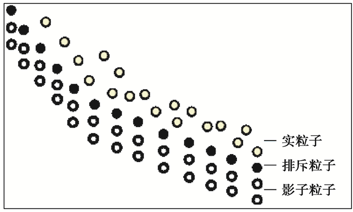 边界条件是SPH数值计算中的一个重要部分,与SPH计算的精确性密切相关。SPH文献中最常用的方法仍然是基于虚粒子的边界处理方法。由于在边坡失稳后运动模拟中,实粒子底部常常由于过大的应力引起较大的加速度,进而速度过大从边界逸出,文中结合了排斥粒子与影子粒子,提出如图 1所示的耦合边界,在速度无滑移边界条件(No-slip boundary)的基础上,增加排斥粒子,以阻止实粒子由于过大的速度引起的逃逸。通过赋予影子粒子一定的速度,实现边界上速度无滑移的效果,如图 1所示。