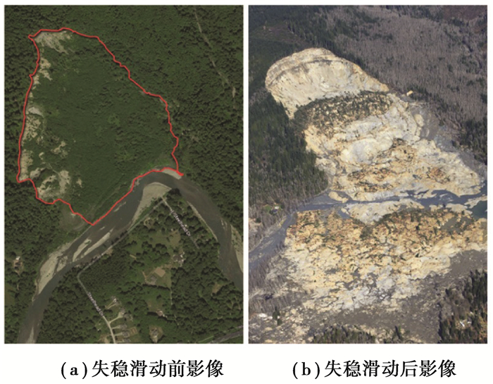 2 实例分析2014年3月22日上午,美国华盛顿州Oso镇的大面积山体滑坡,灾害共造成43人死亡,并有10人受伤,灾后估计经济损失高达5 000万美元[1]。Oso山体滑坡位于Cascade Range北部的一个向西延伸的峡谷,滑坡发生在山谷最狭窄的位置,如图 2所示。调查报告显示,滑坡失稳前3周内的强降雨(降雨量达到约760 mm)是此次滑坡的主要原因。图 3是Oso滑坡发生前后的航拍对比图,图 4显示了在主剖面上边坡失稳滑动前后的地形对比。