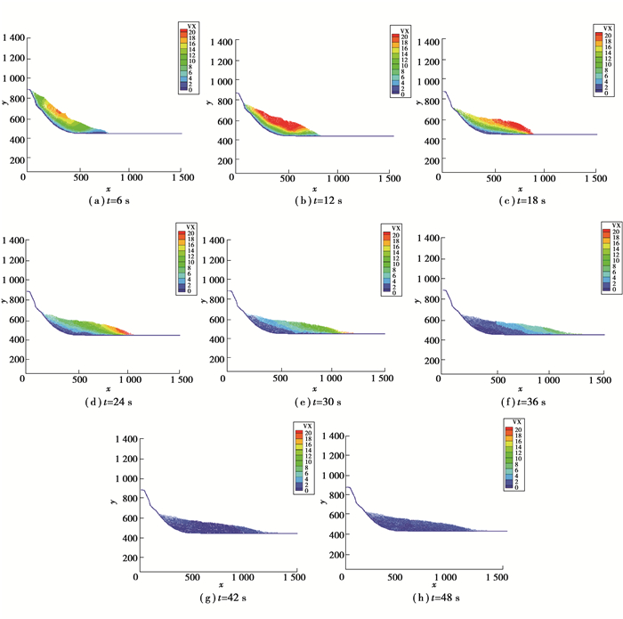 计算结果展现出滑坡失稳运动的整个过程,图 5显示了Oso滑坡在此过程中具有代表性时刻的地形特征,滑坡体沿滑动方向上的速度,如图 5所示。可以看出,当t=6 s时,边坡处于失稳运动前期,在滑坡体的中后部沿滑动方向上的速度最大;随着时间的推移,滑坡体前面部分沿滑动方向上速度越来越大,到达速度最大后转而减小,直到整个运动过程结束,所有SPH粒子在沿滑动方向上的速度都等于零,在48 s的时候基本停止,整个运动过程结束。