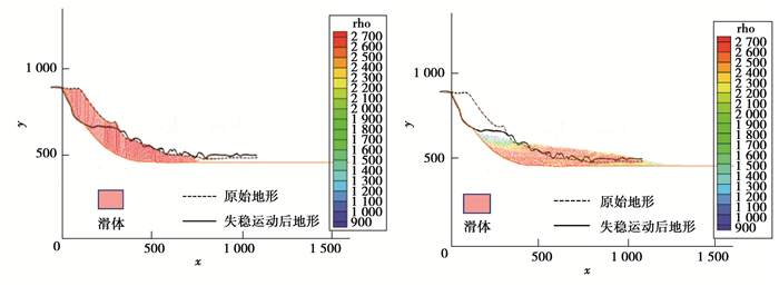 由图 6可知,最后模拟结果得到的滑坡影响范围地表轮廓线与实际雷达测出的轮廓线较为吻合。然而,若对现场数据和仿真结果进行比较,地形特征略有差异,部分差异可能是滑坡体中的不均匀土质或岩土层信息缺乏造成的。滑坡的模拟影响范围与实际影响范围大致相同,说明基于SPH的模拟方法能得到较为准确的结果,对边坡失稳影响范围模拟有一定的适用性。