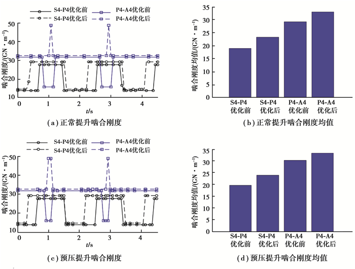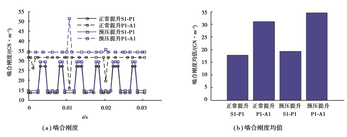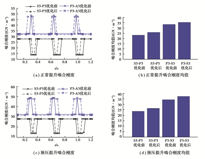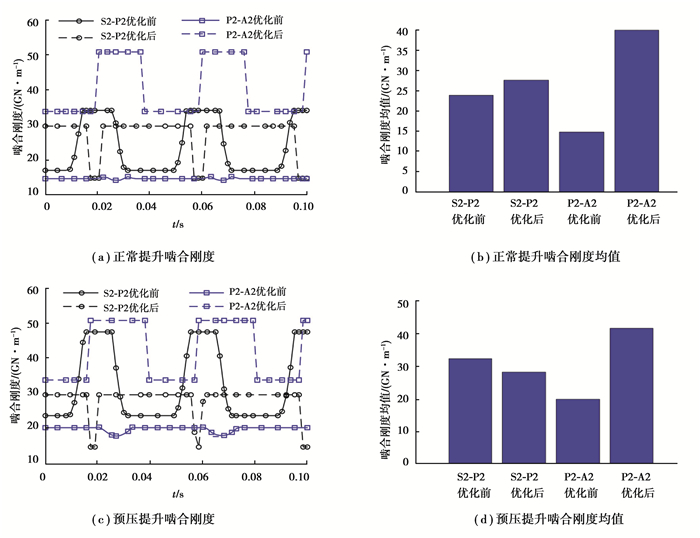3) 在正常提升与预压提升两种工况下,优化后,各齿轮副的啮合刚度均值总体上增大,且第2级行星轮内齿圈(P2-A2)的啮合刚度均值成倍增加。