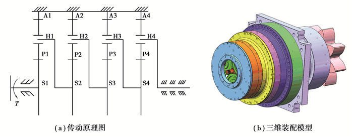 笔者所分析提升齿轮箱采用4级NGW行星传动,其传动原理图如图 2(a)所示,利用SOLIDWORKS建立的三维模型如图 2(b)所示。图中齿轮均为渐开线直齿轮,内齿圈A和箱体固定,各级太阳轮S为扭矩T输入端,经过行星架H并通过行星级功率分流,最终由第4级行星架H4输出驱动输出齿轮轴与桩腿上齿条啮合带动平台升降或支撑平台。该提升齿轮箱的基本参数如表 1所示。