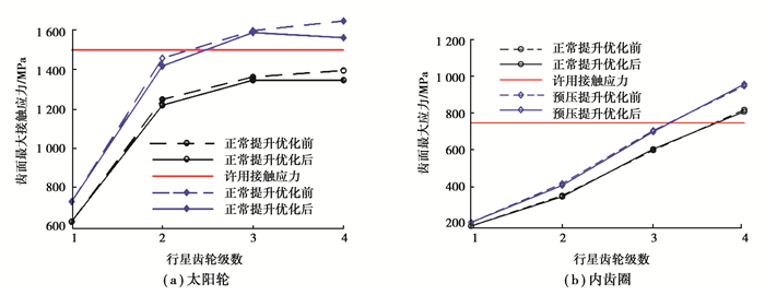 3 结论1) 以重合度为优化目标,齿顶厚/模数>0.3为主要约束条件,对第2到第4级行星轮系进行宏观参数优化,优化后各齿轮副重合度增大,各齿轮的齿顶厚有所下降,全齿高增大,各齿轮齿面最大接触应力小幅下降。