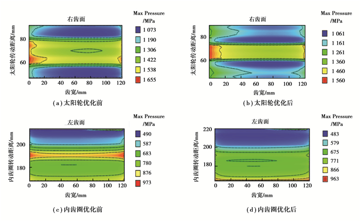 2.1 接触特性分析图 4为正常提升和预压提升2种工况下,优化前后太阳轮和内齿圈齿面最大接触应力。各太阳轮和内齿圈的许用接触应力为1 500 MPa和750 MPa,从图 4(a)可以看出,在预压提升时,第3级和第4级太阳轮的最大接触应力均超出了许用接触应力,因为各齿轮都未经过齿顶修缘处理,优化后太阳轮在2种工况下的最大接触应力均有小幅减小,但优化前后差距较小。由图 4(b)可以看出,优化前后内齿圈在2种工况下的最大接触应力基本不变,第4级内齿圈在正常提升和预压提升时最大应力均大于许用接触应力。第4级太阳轮和内齿圈在预压提升工况下的接触斑点如图 5所示,从图中可以看出齿轮副存在偏载,有必要对其进行修形,以改善齿面应力分布情况,且优化后,太阳轮的接触斑点区变窄,内齿圈的最大接触应力区向下移动。