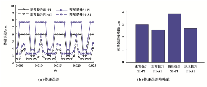 正常提升和预压提升两种工况下,优化后,各齿轮副和4级NGW行星传动传递误差峰峰值总体上减小,且优化后各齿轮副曲线有一个较小的滞后量,主要是重合度增大使双齿啮合区增长引起的。