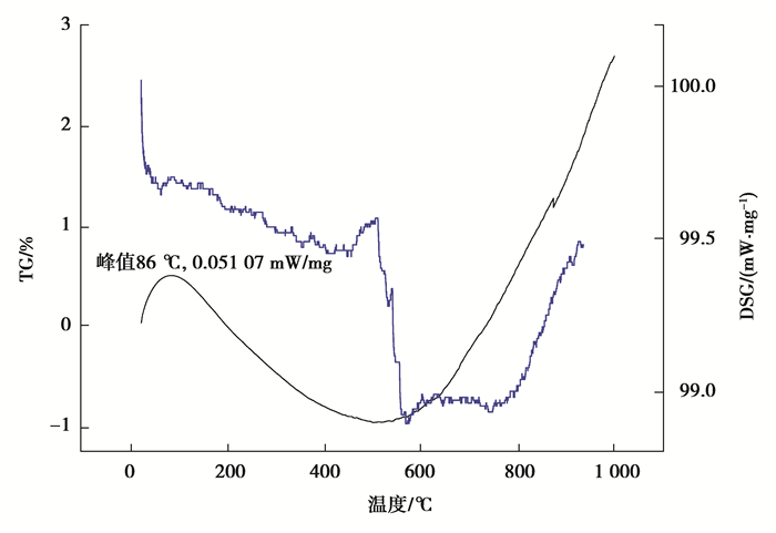 酸溶性钛渣的干燥过程会发生热量与质量的变化,使用热重/差热扫描联用仪(STA449F3, NETZSCH, 德国)对原料进行差热差重(TG-DSC)分析。将10 g酸溶性钛渣置于样品盘内,在不通保护气体的实验条件下进行测试。设定温度区间为0~950 ℃,升温速率为15 ℃/min,酸溶性钛渣在升温过程中质量和热量的数据结果由自动记录仪记录。