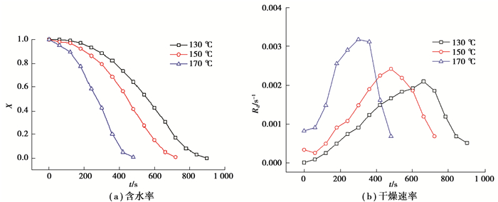 2.2 温度的影响为了研究不同加热温度对样品干燥特性的影响规律,称取酸溶性钛渣质量为50 g、含水量为2%的样品在130,150,170 ℃的温度条件下进行干燥实验。图 3分别显示了不同温度条件下样品的水分含量和干燥速率随时间的变化规律。