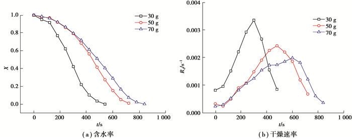2.3 样品质量的影响样品质量是影响干燥过程的一个不可或缺的因素。为了研究不同质量的样品对酸溶性钛渣干燥性能的影响,对质量分别为30, 50, 70 g,含水量为2%的酸溶性钛渣在干燥温度为150 ℃的条件下进行干燥实验,实验结果如图 4所示。