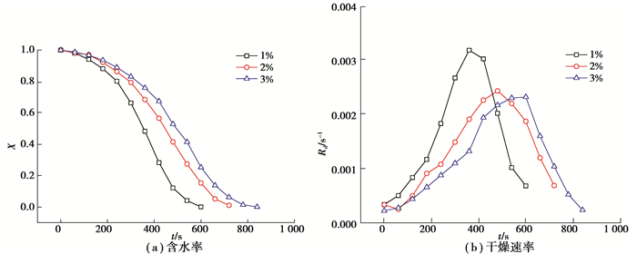 2.4 初始含水量的影响为了研究不同初始含水量的酸溶性钛渣的干燥性能,在150 ℃下,对质量为50 g,初始含水量分别为1%、2%和3%的酸溶性钛渣进行干燥实验,样品的含水率和干燥速率随时间变化的实验结果如图 5所示。