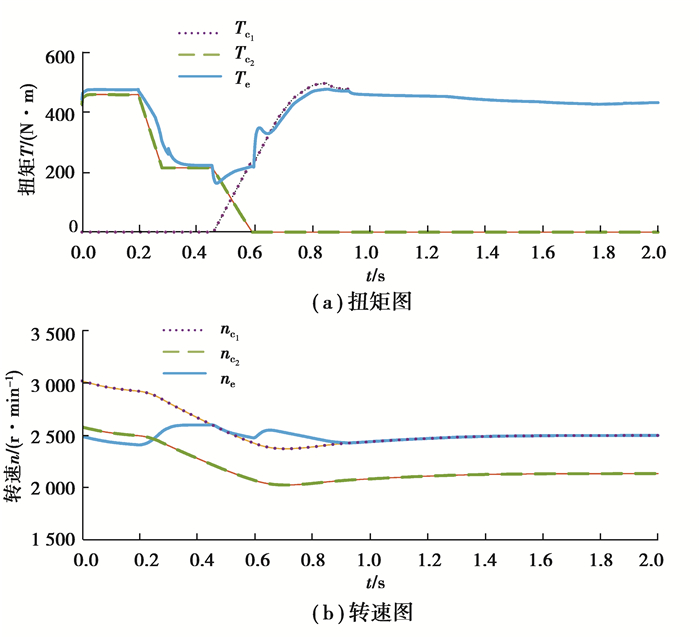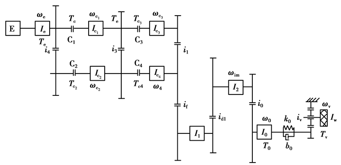 | $ \left\{ \begin{array}{l} {T_{\rm{e}}} = {T_{{{\rm{c}}_1}}} - \frac{{{T_{{{\rm{c}}_2}}}}}{{{i_4}}} = {I_{\rm{e}}} \cdot \frac{{{\rm{d}}{\omega _{\rm{e}}}}}{{{\rm{d}}t}};\\ {T_{{{\rm{c}}_1}}}, {T_{{{\rm{c}}_2}}} = \left\{ \begin{array}{l} 0, \;分离;\\ {T_{{\rm{slip}}}}{\rm{, }}\;{\rm{滑摩;}} \end{array} \right.\\ ({T_{{{\rm{c}}_1}}} \cdot {i_1} + \frac{{{T_{{{\rm{c}}_2}}} \cdot {i_1}}}{{{i_3}}}){i_{{\rm{d}}1}} \cdot {i_{\rm{f}}} - \frac{{{T_0}}}{{{i_0}}} = {I_{{\rm{eq}}}} \cdot \frac{{{\rm{d}}{\omega _{{\rm{im}}}}}}{{{\rm{d}}t}};\\ {T_0}\cdot {i_{\rm{v}}} - {T_{\rm{w}}} = {I_{\rm{w}}}\cdot \frac{{{\rm{d}}{\omega _{\rm{v}}}}}{{{\rm{d}}t}};\\ {T_0} = {k_0}({\theta _0} - {\theta _{\rm{v}}}\cdot {i_{\rm{v}}}) + {b_0}({\omega _0} - {\omega _{\rm{v}}}\cdot {i_{\rm{v}}})。\end{array} \right. $ | (12) |