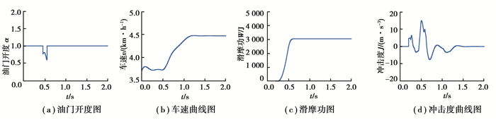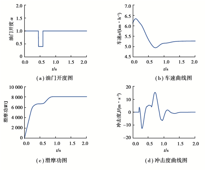 1挡升2挡的仿真结果如图 8~9所示,从中可见所制定的控制策略得到的结果良好,换挡过程中车速变化幅度小,冲击度在20 m/s3之内,滑摩功为3 100 J,油门开度变化见图 9(a)。