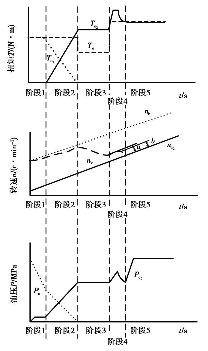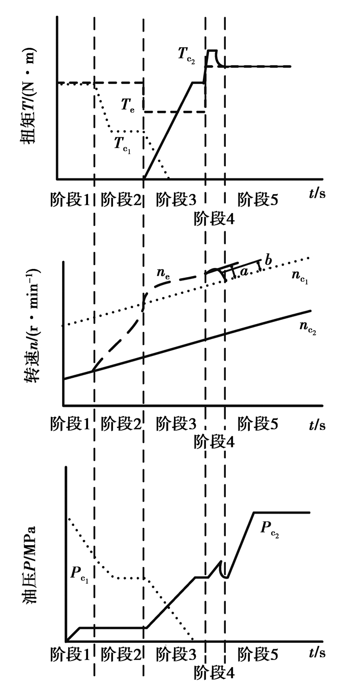 2.1 升挡过程在升挡过程中,动力换挡过程分为换挡准备、转矩相、惯性相、离合器同步、换挡结束阶段,如图 3所示的1~5阶段。图中Pc1,Pc2为离合器C1,C2的油压,nc1,nc2为离合器C1,C2从动盘转速,a,b为离合器转速差界限。