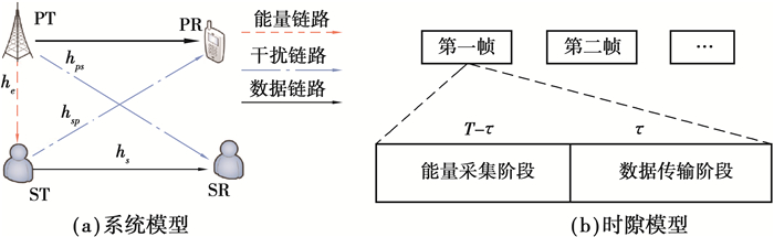 1 系统模型Underlay模式下的RF EH-CRN系统如图 1(a)所示,由次用户发射机(ST)和次用户接收机(SR)组成的次用户网络与由主用户发射机(PT)和主用户接收机(PR)组成的主用户网络并存。主用户发射机首先采集由主用户发射机射频信号发出的能量,然后在相同频带作为主用户发射机同次用户接收机通信。支持3种链路,即能量链路(PT-ST)、干扰链路(PT-SR和ST-PR)和数据链路(ST-SR和PT-PR)。假定主用户发射机和主用户接收机在授权频谱始终处于相互通信状态。所有信道会出现块衰落,各分块的衰落状态维持不变,但分块之间会发生变化。假定次用户接收机有稳定供电,次用户发射机完全由采集的射频能量自行供电。此外,次用户发射机在半双工模式下工作,即可分别进行采集能量或传输数据但无法同时完成。如图 1(b)所示,一帧数据(次用户发射机的时间设为T)分为2个时隙,即能量采集时隙T-τ和数据传输时隙τ。