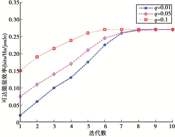 值得注意的是,由于τ和e遵循KKT条件且在算法内循环中被迭代优化,此二变量将收敛到拉格朗日对偶变量λ和υ下的最优值。同时由OP3的凸性(Convexity)可知,对于任意给定q值,能保证变量λ和υ可收敛到最优解[13]。总之,所提算法与文献[14-15]中所述Dinkelbach结构的收敛性一致,具有的快速收敛速率。